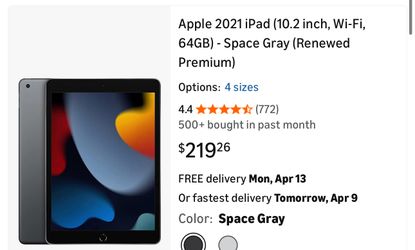 Apple 2021 iPad (10.2 inch, Wi-Fi, 64GB) - Space Gray (Renewed Premium)$175Los Angeles, CA