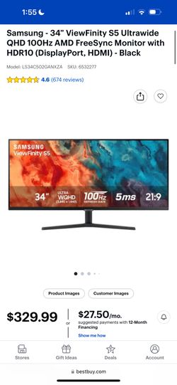 Samsung - 34” ViewFinity S5 Ultrawide QHD 100Hz AMD FreeSync Monitor with HDR10 (DisplayPort, HDMI) - Black $280Providence, RI