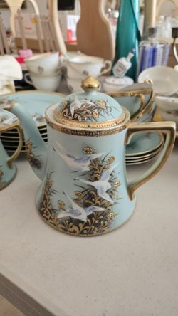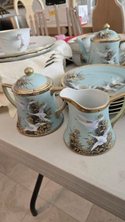 Nippon 19th Century Antique Japan Teal Gold Gilt Jeweled Hand Painted Flying Swan Geese Tea Pot Creamer, Sugar, Plates, Cups$550Boca Raton, FL