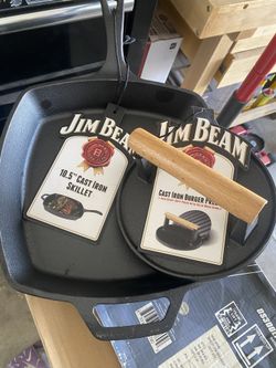 Jim Beam 10.5" cast iron skillet and a Jim Beam cast iron burger press. $45San Diego, CA
