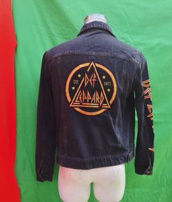 Def Leppard dark gray denim jean jacket blazer graphic patch men's size LARGE $48Long Beach, CA