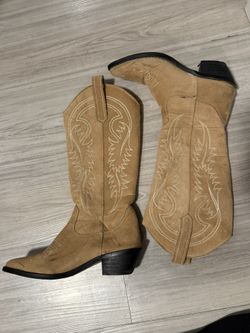 Tan Faux Suede Mid-Calf Western Cowboy Boots White Embroidery Pointed Toe Chunky Heel Women’s 36 / Size 6$40Phoenix, AZ