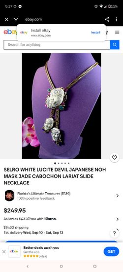 SELRO WHITE LUCITE DEVIL JAPANESE NOH MASK JADE CABOCHON LARIAT SLIDE NECKLACE$125Bakersfield, CA