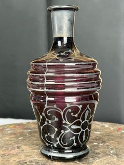 Vintage Ruby Red Glass Decorative Bottle Vase Silver Floral Design 8in$10Oakland, FL