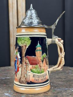 Vintage West Germany Lidded Beer Stein Ceramic Relief Village Scene Pewter Lid$20Oakland, FL