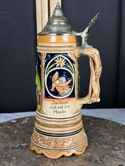 Vintage German Lidded Beer Stein Hunting Scene Relief Ceramic Pewter Lid$30Oakland, FL