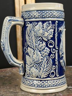Vintage German Stoneware Beer Stein Blue White Relief Barley Hops Mug 6.5in$15Oakland, FL