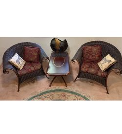Set of 2 dark brown wicker/rattan metal frame barrel arm chairs with cushions and pillows. $125Palm Springs, CA