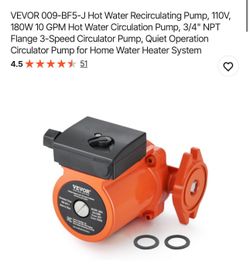 VEVOR 009-BF5-J Hot Water Recirculating Pump, 110V, 180W 10 GPM Hot Water Circulation Pump,$45Chicago, IL
