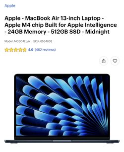 Apple - MacBook Air 13-inch Laptop - Apple M4 chip Built for Apple Intelligence - 24GB Memory - 512GB SSD - Midnight$1,000Houston, TX