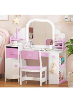 Kids Vanity with Lights, Princess Makeup Vanity Desk with Open Bookshelf, Storage Cabinet & Shelves, Toddler Vanity Table and Chair Set, Pretend Play $150San Leandro, CA