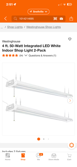 Westinghouse 4 ft. 50-Watt Integrated LED White Indoor Shop Light 2-Pack$25Snellville, GA