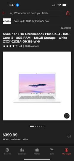 ASUS 14" FHD Chromebook Plus CX34 - Intel Core i3 - 8GB RAM - 128GB Storage - White (CX3402CBA-DH388-WH)$300Claremont, CA