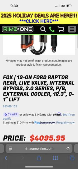 FOX | 19-ON FORD RAPTOR REAR, LIVE VALVE, INTERNAL BYPASS, 3.0 SERIES, P/B, EXTERNAL COOLER, 12.3", 0-1" LIFT$1,750Chicago, IL