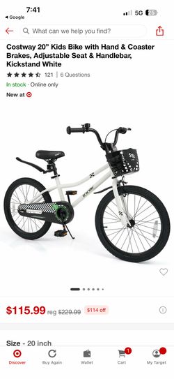 Costway 20" Kids Bike with Hand & Coaster Brakes, Adjustable Seat & Handlebar, Kickstand White$75Chula Vista, CA