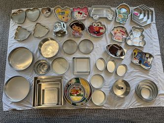 Lot of 50 Cake Pans. Wilton, Wedding, Round, Square, Hexagon, Football, Heart, Hello Kitty, Teddy Bear, Elmo, Tinker Bell, Race car Cake Pans$300Canton, GA