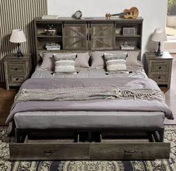 ❤️🔥 King size bed frame, wooden platform with 51.2-inch shelf headboard, 2 drawers, charging station, no box spring required, no noise, rustic gray$$195Riverdale, GA
