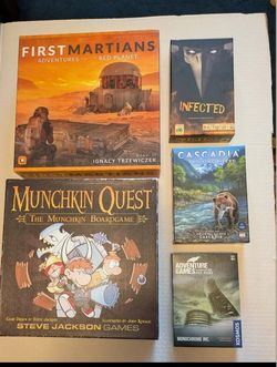 Board Games for Sale: First Martians, Galaxy Trucker, Infected, Cascadia Rolling Rivers, and Adventure Game: Monochrome Inc.$10Santa Fe Springs, CA