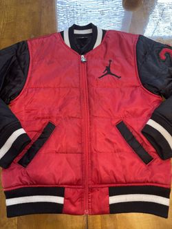 Boys Air Jordan 23 Quilted Bomber Jacket w Embroidered Logo Sz M 12/14 Black Red Boys Air Jordan Varsity Jacket Winter Coat Jordan Logo Size 12-14$20Chicago, IL