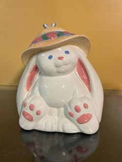 Ceramic Rabbit Cookie Jar with Lift-Off Straw Hat Lid, Pink Blue Floral Accents$50Oceanside, NY
