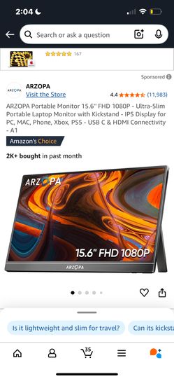 ARZOPA Portable Monitor 15.6'' FHD 1080P - Ultra-Slim Portable Laptop Monitor with Kickstand - IPS Display for PC, MAC, Phone, Xbox, PS5 - USB C & HDM$55Las Vegas, NV