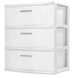 3-Drawer Wide Weave Tower, Plastic Storage Box with Pull Handles, Decorative Cabinet for Bedroom, Bathroom & Office, White$20Wilmington, NC