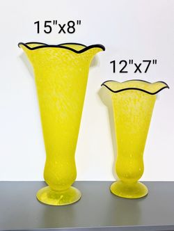 Satin Tango Vase Yellow Handblown Glass with blue trim on top$50Fort Worth, TX