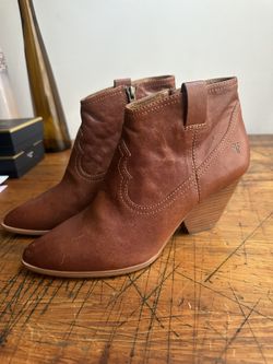 FRYE Reina Cognac Leather Stitch Detail Wooden Stacked Heel Western Booties Size 10 $120New York, NY
