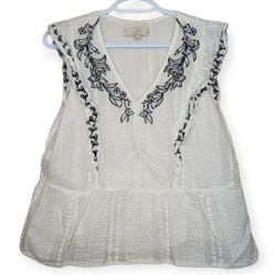 LOFT Petites MP White Sleeveless Blouse Blue Embroidery Ruffled Detail$41San Diego, CA