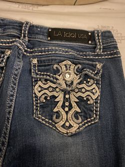 Blue L.A Idol jeans with white embroidery $30Merced, CA