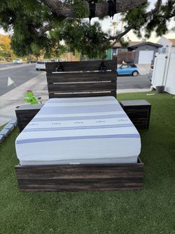 Beautiful Queen-size bed with a headboard lamp and two nightstands with drawers; includes box spring and mattress. Wood finish. 5 pieces.$450Poway, CA