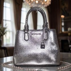Michael Kors Silver Metallic Python Embossed Satchel Tote Bag Lock Charm$90San Antonio, TX