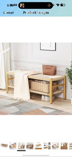 New in box Recaceik Indoor Entryway Bench with Paper Cord Ottoman & Grid Storage Rack and 2 Baskets, Mid-Century Long Bench with Rubber Wood Legs, Fre$50Rialto, CA