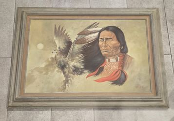 Vtg Native American Portrait Hawk Painting Signed Framed 1984 31x43" Southwestern$150Scottsdale, AZ