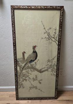 Vintage Asian Japanese Pheasants Embroidered Silk Framed Art 48x22" Traditional