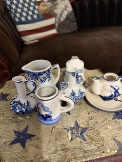 This is a collection of vintage Delft Blue miniature pitchers and vases. $25Chino, CA