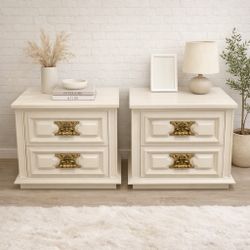 Soft European Cottage Off-White Nightstand Pair | Vintage Gold Hardware | 2-Drawer Set $250San Marcos, CA