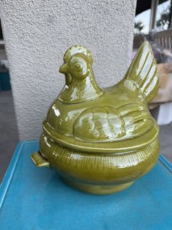 Vintage California Pottery Avocado Green Soup Tureen Hen Chicken Shaped Olive 40$50Carlsbad, CA