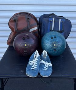 Set of 2 Bundle Vintage Brunswick bowling ball bag with 2 vintage Bonanza 300 bowling ball And Shoes$100Henderson, NV