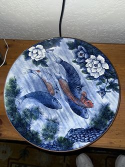 Japanese Porcelain Round Large Plate Vtg Chrysanthemum Carp Koi Fish Blue$160Carlsbad, CA