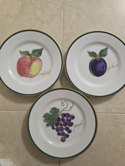 Crate & Barrel Fruit Salad Plates Set Apple Plum Grape Gold Rim$20Halndle Bch, FL