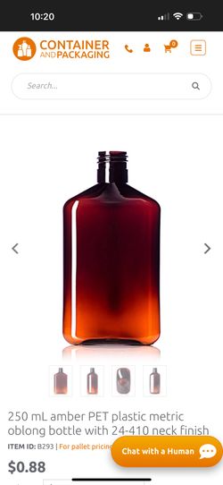250 mL amber PET plastic metric oblong bottle with 24-410 neck finish$720Dallas, TX