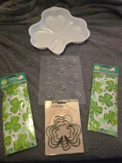 ST PATRICK'S DAY PARTY ITEMS - (1) CAKE MOLD + (7) CANDY MOLDS + (2) BAGS CANDY MELTS (2) 20PC PARTY BAGS (1) 4PC COOKIE CUTTERS$40Church Hill, MD