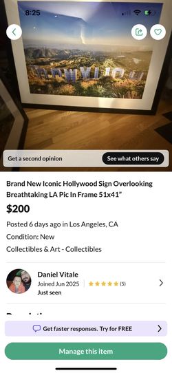 Brand New Iconic Hollywood Sign Overlooking Breathtaking LA Pic In Frame 51x41”$100Los Angeles, CA