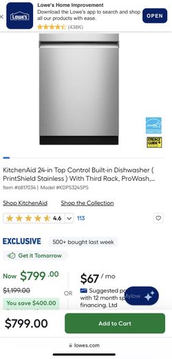 KitchenAid 24-in Top Control Built-in Dishwasher ( Stainless Steel with PRINTSHIELD Finish ) , 47-Decibel$450Warner Robins, GA