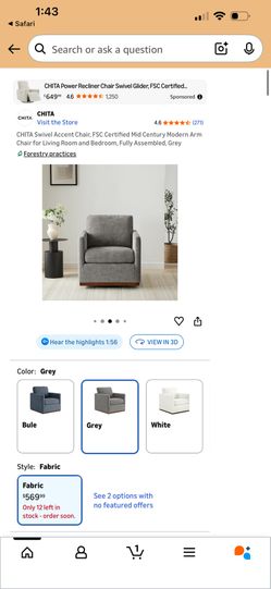 CHITA Swivel Accent Chair, FSC Certified Mid Century Modern Arm Chair for Living Room and Bedroom, Fully Assembled, Grey$175Kearny, NJ
