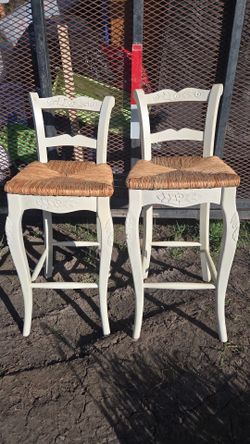 Pair of Cream Carved Wood Woven Seat Bar Stools 47"$150Lodi, CA