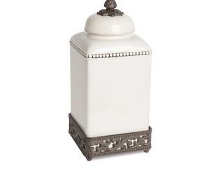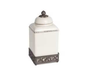 Cream Stoneware 13.5” Canister With Metal Acanthus Leaf Base.$65Olathe, KS