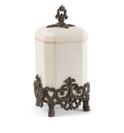 Cream Stoneware 16” Canister With Metal Provincial Acanthus Leaf Base.$85Olathe, KS