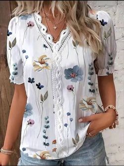 EMERY ROSE Women's Vacation Leisure Floral Print Contrast Lace Puff Sleeve Shirt,Short Sleeve Tops. Sizs: 3XL(16 us)$5Peoria, AZ